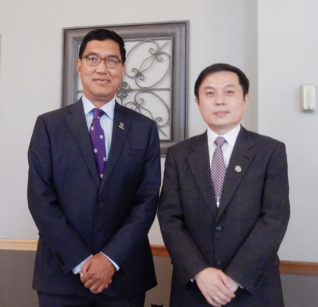 Amit Chakma校长(左)欢迎胡海岩校长到访