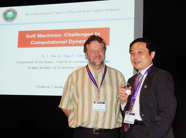 一一代表团随后参加了在加拿大蒙特利尔召开的“第24届世界力学家大会”(The 24th International Congress of Theoretical and Applied Mechanics, ICTAM 2016),胡海岩校长作了题为“柔性机器:计算动力学的挑战”的特邀报告。