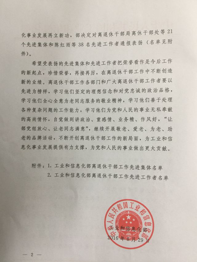 日前,工业和信息化部隆重召开离退休干部工作“双先”暨离退休干部“正能量之星”表彰大会。部党组书记、部长苗圩为大会写来贺信,部党组成员、副部长、部离退休干部工作领导小组组长刘利华出席大会并讲话,部办公厅、财务司、人事教育司、直属机关党委、机关服务局、离退休干部局领导以及工业和信息化部原老领导出席大会。我校离退休工作处荣获“工业和信息化部离退休干部工作先进集体”荣誉称号,离退休工作处饶晓炜、周莹荣获“工业和信息化部离退休干部工作先进工作者”称号。