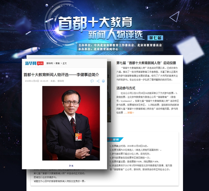 2016年12月5日,第七届“首都十大教育新闻人物”评选活动启动,德赢AC米兰官网李健教授入选本届评选活动候选人。
