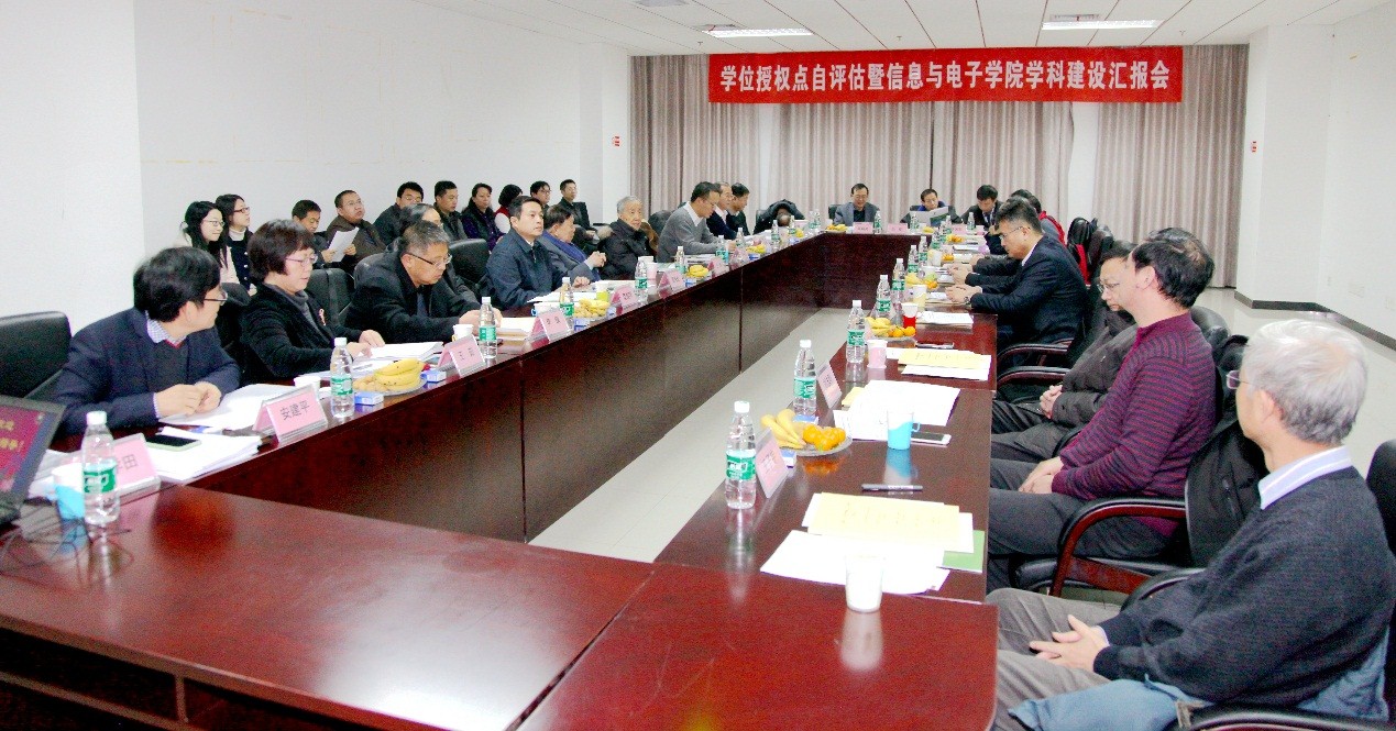 信息与电子学院安建平院长对学院的基本情况进行了介绍,并从师资队伍、人才培养、科学研究、社会服务四个方面对信息与通信工程学科总体情况作了汇报。接着,信息与电子学院王学田教授从基本情况、建设成效、存在问题分析、持续改进和提升计划四个方面对电子与通信工程专业学位授权点的建设情况进行了汇报。