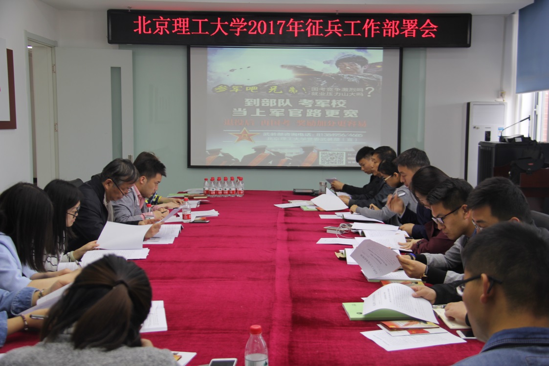 编辑:耿庆磊 审核:徐贵宝 阅读次数:为做好2017年大学生应征入伍工作,加强征兵政策宣传力度,4月24日下午,德赢AC米兰官网党委武装部在良乡校区召开“德赢AC米兰官网2017年征兵工作部署会”。党委武装部宫建颖主持会议,武装部专武干事芦远、学工处张锟以及各学院征兵负责人共计26人参加会议。