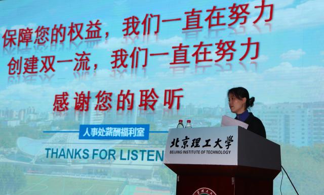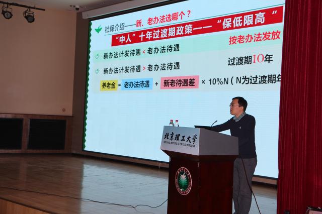 杨静对到会人员表示欢迎。她表示,养老保险改革和每一位老师的切身利益息息相关,随着市场经济的发展,事业单位现行养老保险制度显现出各种问题,改革势在必行。薪酬福利办公室高级主管王智鹏从机关事业单位工作人员养老保险改革相关政策,退休中人待遇核定办法,我校退休人员近年待遇调整介绍三个方面进行了详细讲解。