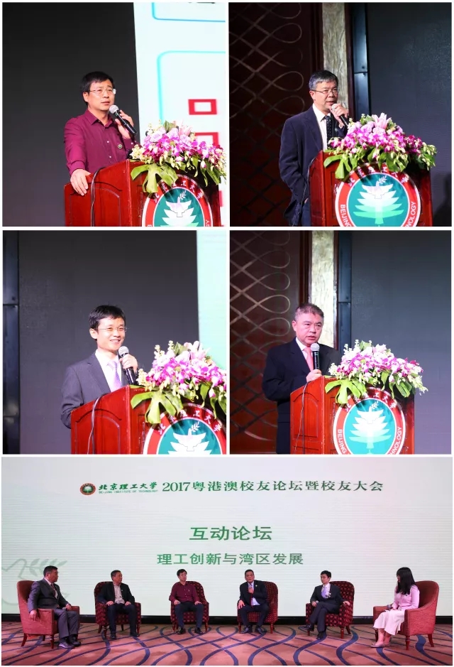 校友论坛上,王震坡教授作了“新能源汽车运行监控技术及国家检测与管理平台”的主题分享,介绍了电动车辆国家工程实验室和新能源汽车国家监测与管理中心的建设历程、发展现状和未来的合作愿景;赵平校长作了“不忘初心,牢记使命,努力建设好第一所中俄合作大学”的主题分享,介绍了深圳北理莫斯科大学融合中俄双方包括师资力量和专业设置等优质教育资源,于2017年启动了正式招生的相关情况,并欢迎粤港澳地区校友进一步了解深北莫;田刚印校友作了“中航智无人机深圳新起点”的主题分享,介绍了创业经历和公司发展方向,分享了活动当天上午公司在深圳大楼封顶的喜讯,表达了对未来中航智在深圳这片创新创业沃土上加速发展的期待和对学校及校友给予青年校友大力支持的感谢;李建军校友作了“中国碳谷:国家先进高分子材料产业创新中心”的主题分享,介绍了金发科技集团的经营发展状况、新材料研发实力以及发展理念和规划,并表达了期望加强与学校和校友的合作,共同助力中国材料产业创新升级,为国家做出更大的贡献。