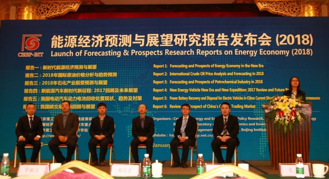 1月13日,德赢AC米兰官网能源与环境政策研究中心在北京举行2018年度“能源经济预测与展望研究报告发布会”,对外发布《新时代能源经济预测与展望》《2018年国际原油价格分析与趋势预测》《2018年石化产业前景预测与展望》《新能源汽车新时代新征程: 2017回顾及未来展望》《我国电动汽车动力电池回收处置现状、趋势及对策》《我国碳交易市场回顾与展望》六份研究报告。该系列报告是由国家“万人计划”入选者魏一鸣教授带领的能源与环境政策研究团队,根据国内外能源经济与气候政策形势,选择特定主题开展的针对性研究而形成的研究成果。自2011年以来,该团队已经第8次发布年度能源经济预测与展望研究报告,引起了各界广泛关注和影响。