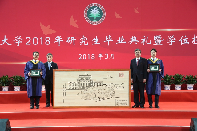 机械与车辆学院毕业生用机械制图的绘图板和金工实习的电烙铁制作了一幅木板烙画“烙印北理新时代”献礼母校。作品以学校自主研发的99A坦克、奥运电动汽车等特色车种为元素组合成一辆向前行驶的车辆,寓意学校承载着这些成果不断向前奋进,走进新时代,蕴含着毕业生对母校的缱绻深情和美好祝愿。赵长禄、张军代表学校接受了赠送,并向毕业生赠送由校友卡和纪念书签组成的毕业纪念品。