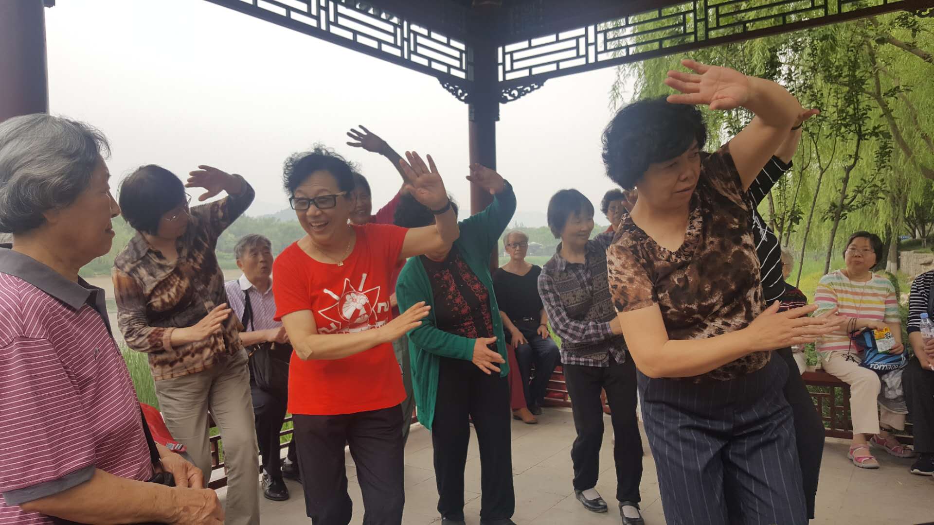 沿湖泊北岸而行,一行人来到蜿蜒曲折、依水而建的曲廊,坐下休息,正对一片翠绿的松林,松涛澎湃别有一番风韵。面对如此美景,大家兴之所至击掌而歌,咏歌之不足,又手之舞之足之蹈之,充分展现北理工离退休教职工良好的精神面貌和积极向上的阳光心态。