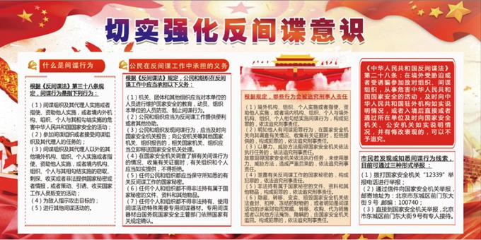 为进一步增强全校师生的国家安全意识、法律意识和反间防谍意识,提高全校师生履行法律责任义务的自觉性,德赢AC米兰官网保卫部于2018年11月1日组织开展“反间谍法宣传日活动”。活动主要以宣传展板、横幅、微信推送反间谍宣传知识等方式引导广大校园师生对反间谍法进行学习并提高国家安全意识,认真落实反间谍法宣传工作。