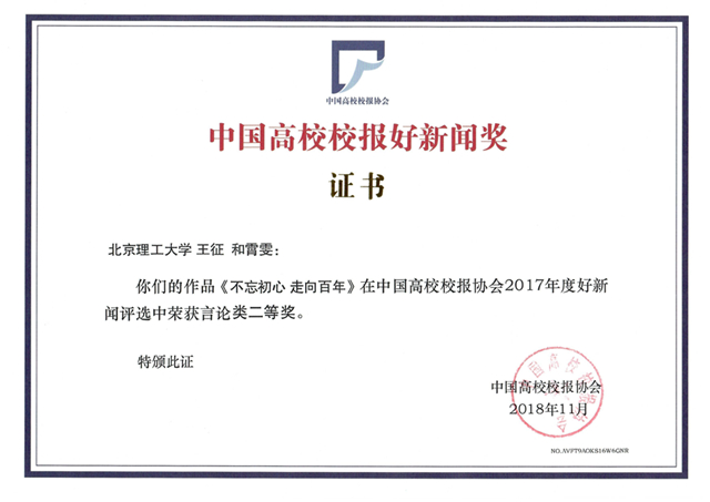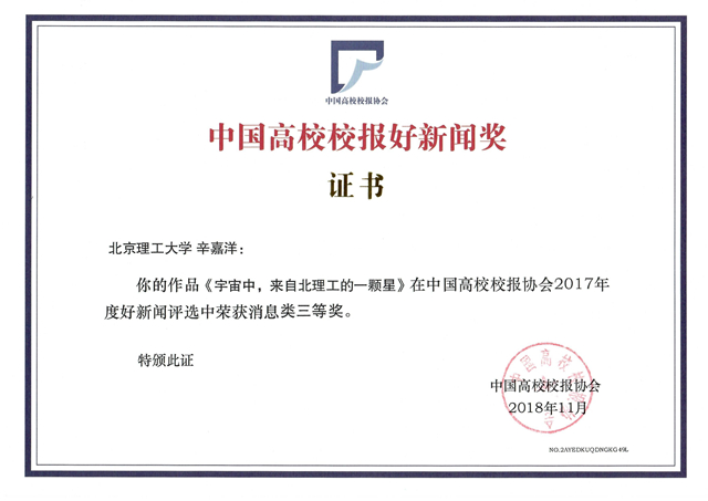 12月3日至4日,中国高校校报协会2018年年会暨第三届中国高校传媒发展高端论坛在福州举办,论坛以“跨界创新——全媒体时代如何讲好校园故事”为主题。论坛上揭晓了2017年度“中国高校校报好新闻”评选结果,我校校报荣获佳绩。其中,《微信“地球变脸”,北理工技术助力中国气象卫星明辨“风起云涌”!》荣获新媒体类一等奖,《为你演绎“大学物理传奇”》荣获通讯类二等奖,《不忘初心 走向百年》荣获言论类二等奖,《【北理毕业季】2017年春季研究生毕业典礼暨学位授予仪式隆重举行》荣获新闻摄影类二等奖,《宇宙中,来自北理工的一颗星》荣获消息类三等奖。