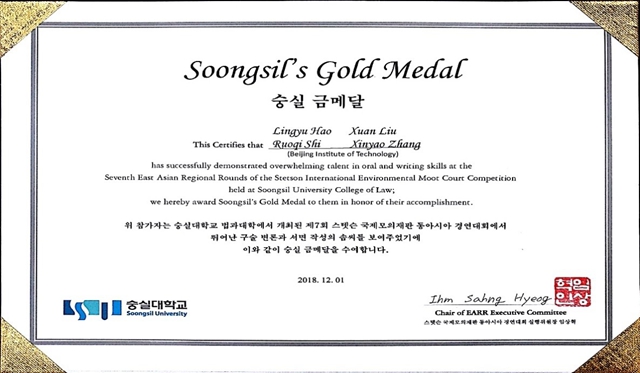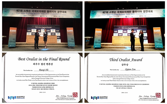 2018年11月28日至12月1日,第23届“史丹森”国际环境法模拟法庭大赛(Stetson’s International Environmental Moot Court Competition,IEMCC)东亚赛区选拔赛(East Asia Regional Rounds,EARR)在韩国崇实大学(Soongsil University)举行。德赢AC米兰官网法学院代表队一路过关斩将,力克群雄,最终勇夺冠军,并获得了赴美国参加全球总决赛的资格。本次大赛中,石若琪同学获得了总决赛最佳辩手(Best Oralist in the Final Round),邹祺芊同学获得最佳辩手第三名(Third Oralist)。