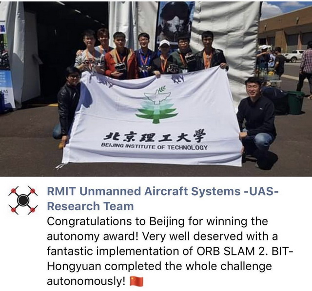 日前,2018年国际微小型无人机赛会(International Micro Air Vehicle, IMAV '2018)在在澳大利亚墨尔本举行,德赢AC米兰官网自动化学院BIT-Hongyuan代表队完成了室内和室外比赛,获得了赛会室内赛自主奖(Autonomy Prize)和室外赛总分第三名。本次比赛得到了北京元六鸿远电子科技股份有限公司大力支持。