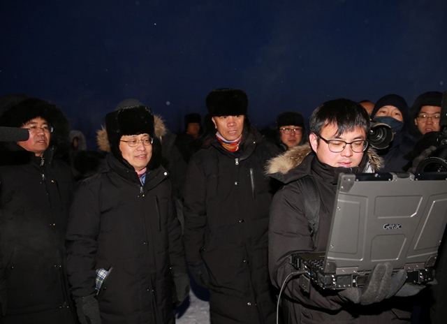 孙逢春院士(左三)与王朝阳教授(左二)在极寒环境试验现场