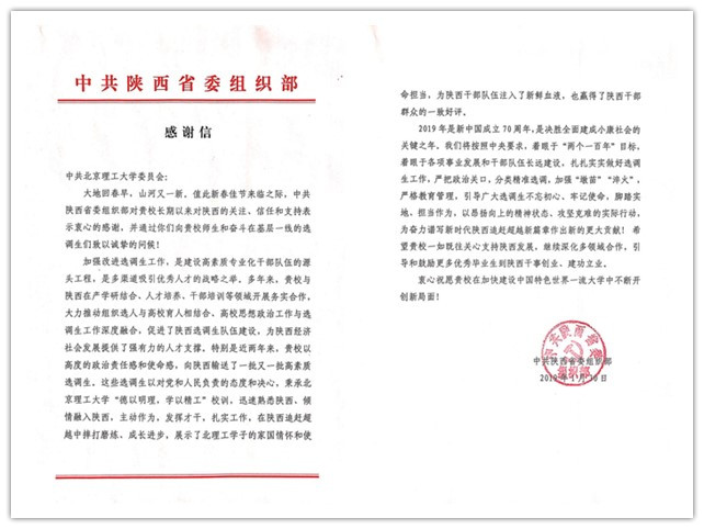 在农历新春佳节来临之际,1月30日,中共陕西省委组织部向学校党委发来感谢信,为多年来学校对陕西的关注、信任和支持,尤其是在选调生队伍建设方面的大力配合表示感谢,并送上了新春的祝福。一封感谢信不仅见证了北理工与三秦大地的深厚友谊,更是对学校选调生工作的充分肯定。2018年9月,中共广西区委组织部也曾专门向学校发来同样的感谢信,对我校长期以来扎实开展选调生工作表示感谢和肯定。