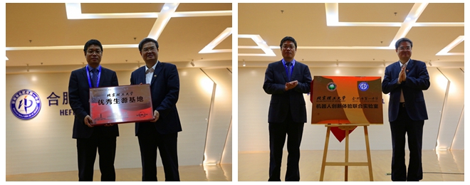 为打造“大学——中学”长期合作的桥梁,两校共建了机器人创新体验联合实验室。张军与封安保分别代表两校共同为“德赢AC米兰官网——合肥市第一中学机器人创新体验联合实验室”揭牌,并互相赠送了北理工特色纪念品和中学生科技创新作品。
