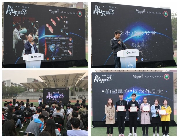 随后,与会嘉宾为“航天嘉年华”活动“仰望星空”网络文化作品大赛获奖同学颁奖。校团委副书记刘渊在致辞中希望同学们以习近平新时代中国特色社会主义思想为指导,深入学习宣传贯彻党的十九大精神,要把强大国家、复兴民族的伟大使命用实际行动书写在浩瀚星空,努力成为能够担当民族复兴大任的时代新人。