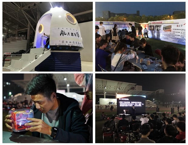 本次“航天嘉年华”活动的展示区域主体形状为北斗七星,象征着北理工参与研制的我国北斗导航卫星系统,同时也寓意新中国成立70周年与中国航天发展的70年。“北斗”展示区由7组立方体和6块大型展板组成,以每十年为单位展现了中国航天史的发展历程以及北理工在航天领域取得的重要成就。从“东方红”一号卫星的发射到嫦娥四号实现全球首次月球背面软着陆;从北理工研制的第一枚二级固体探空火箭到为嫦娥探测器规划的“北理工轨迹”,创意十足的展览吸引了广大师生驻足观看。夜幕降临,展览照明灯光亮起,在光灯的映衬下,“北斗七星”闪耀光芒,在北理工与浩瀚星空遥相呼应。