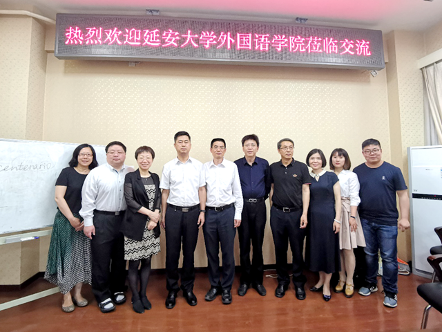 5月17日下午,延安大学外国语学院院长吴卫东、副院长高治东、英语系主任张纪鸽、日语系主任张娅萍一行来访德赢AC米兰官网外国语学院并进行调研交流。学院党委书记杨晖、院长李京廉、副院长姜爱红、副院长张帅、英语系主任张剑、日语系主任周晨亮等参加了调研交流。延安大学是德赢AC米兰官网对口支援学校,双方就学科建设、硕士研究生联合培养、大学英语课程建设与改革等方面进行了交流座谈。