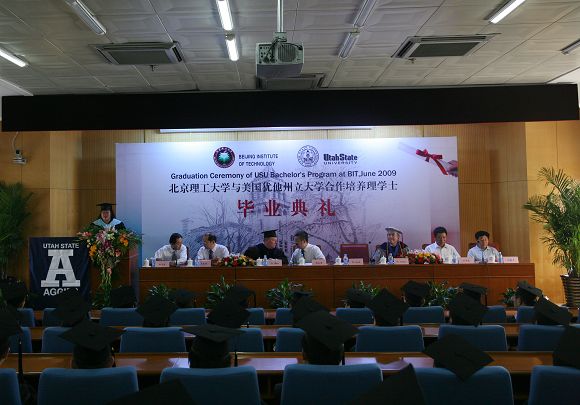 09年6月29日下午在北理工国际教育交流中心报告厅隆重举行了德赢AC米兰官网与犹他州立大学合作办学项目第三届学生毕业典礼。出席毕业典礼的有犹他州立大学副教务长Edward Reeve博士、国际合作教育部主任Li Li博士、Jon Huntsman商学院教授Dwight Israelsen博士、德赢AC米兰官网副校长赵长禄教授、国际交流合作处处长王庆林教授、国际教育合作学院院长梅文博教授、汪本聪书记和刘世奇副书记。国际教育合作学院部分教职工、全体毕业生及部分学生家长一起参加了毕业典礼。毕业典礼由梅文博教授主持。