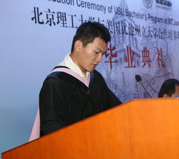 刘云同学代表全体毕业生发言,他用充满激情的语言对德赢AC米兰官网和犹他州立大学的悉心培养表达了感谢和感恩之情,并代表全体同学表达了将来步入工作岗位一定脚踏实地,为母校增光添彩的决心。郎曼同学代表在校生发言,她表示将以师兄师姐们为榜样,珍惜机会,努力学习,刻苦钻研,争取更好的成绩。