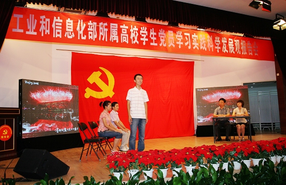 此次报告会汇集了工信部下属7所高校学生党员在学习实践科学发展观中总结的优秀经验,并以报告、短剧等形式予以展示。我校共有50余名师生参加了报告会的演出,其中, 3名学生党员代表和设计学院书记杨海滨、管理学院辅导员彭明雪模拟展示了我校德育答辩的精彩内容。
