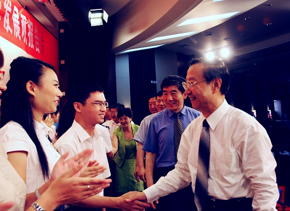 报告会结束后,李毅中部长等部委领导走上台与同学们亲切握手并希望学生党员以科学发展观为引领,在今后取得更大的成绩。