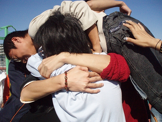 赶紧跑,同学也在一旁加油鼓劲!