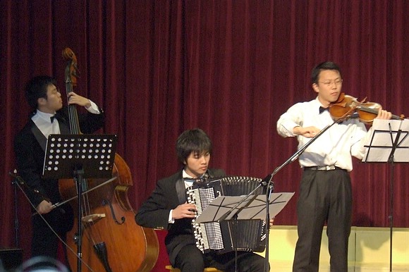 我校同学还演奏了小提琴与钢琴协奏曲《沉思》、巴扬琴与小乐队表演《遗忘》、《洞》等曲目。演出高潮迭起,非常精彩。