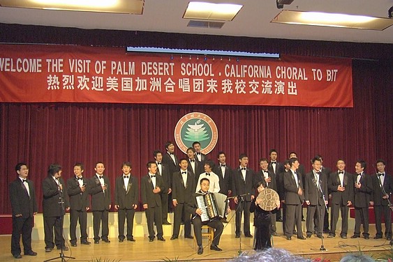 2006年4月10日,中教报告厅里迎来了一群特殊的客人,他们是来自美国加州沙漠棕榈学校的老师、同学和家长们。他们与我校大学生艺术团合唱团进行了一次精彩的交流演出。