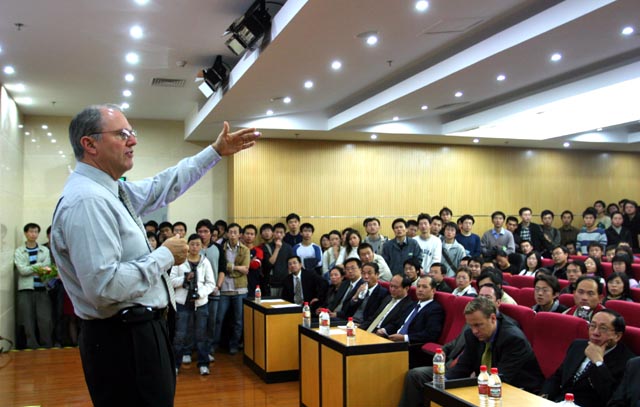 Mundie先生来到图书馆报告厅为早已在此等候的三百多名师生进行了题目为《由灵活组合来解决并发及复杂问题》的专题讲座,并通过回答提问的方式与在座的同学进行了交流。