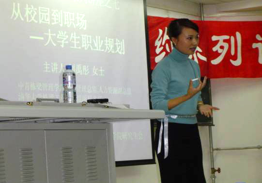本次讲座由北京大学法学硕士、中国栋梁工程人力资源总监、团中央网络影视中心项目主任刘禹彤女士主讲,所讲的话题是大学生极其关心和感兴趣的,即大学生毕业后的出路问题和大学生初入职场应该注意的若干事项。