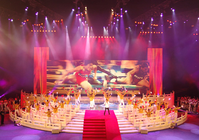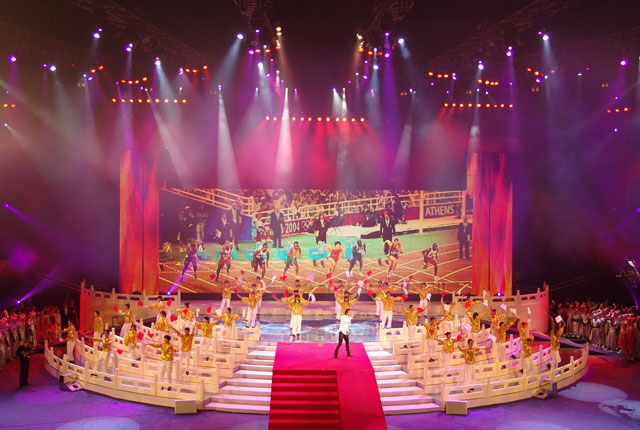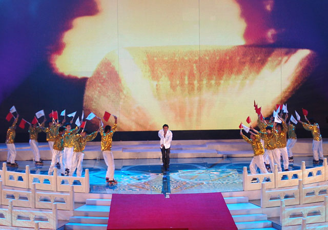 文艺演出的第四个节目是《为你荣光》,由香港著名歌星谢霆锋演唱歌曲,我校同学担任伴舞,其精彩的表演赢得了现场观众的阵阵欢呼。