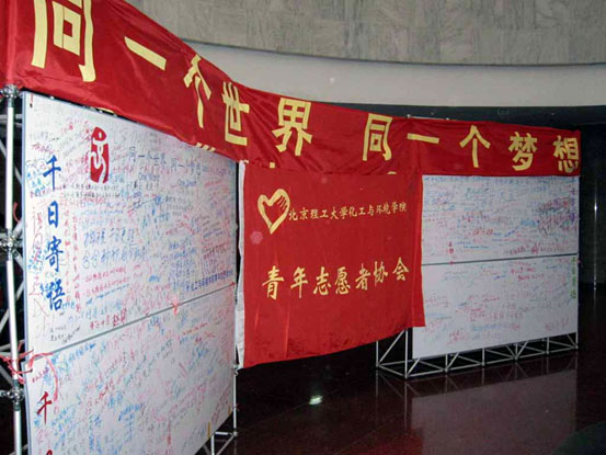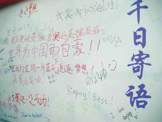 2005年11月12日是北京2008年奥运会倒计时整整1000天的日子,也是大家翘首以盼的一天。2008年8月8日,这个北京奥运会开幕的日子已经不远,化工与环境学院青年志愿者协会结合我校实际情况,于11月11日和12日两天在中心教学楼一层大厅举办“迎奥运千日寄语”大型留言活动,希望同学们在这特殊的日子里为我们的奥运会诚挚的祝福,支持北京举办举办奥运会,并通过本次活动呼吁同学们奉献自己的美好青春,施展大学生的聪明才智支持奥运、服务奥运。