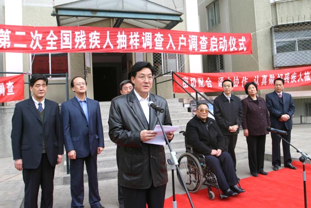 国家残疾人联合会主席、第二次全国残疾人抽样调查领导小组组长邓朴方,国务院副秘书长、第二次全国残疾人抽样调查领导小组副组长张勇,中国残联副理事长、第二次全国残疾人抽样调查领导小组办公室主任程凯,中国残联办公厅副主任、第二次全国残疾人抽样调查办公室常务副主任张新龙,中国残联维权部副主任、第二次全国残疾人抽样调查办公室副主任陈新民,北京市副市长、北京市抽样调查领导小组组长孙安民以及我校常务副校长李志祥、副校长赵显利出席了启动仪式。