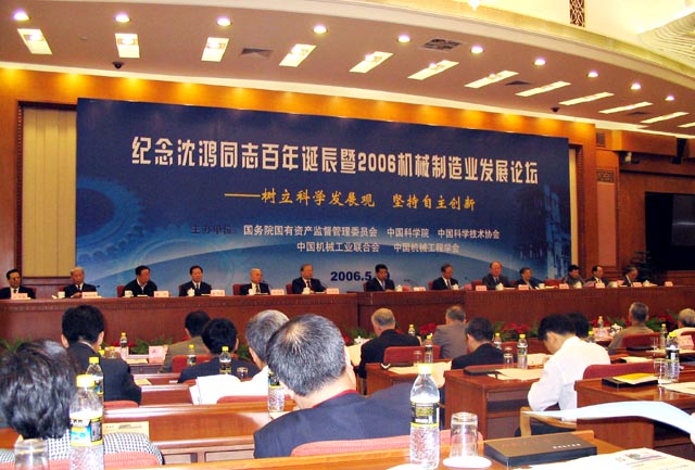 5月19日,纪念沈鸿同志百年诞辰暨2006机械制造业发展论坛在人民大会堂常委会议厅举行。贾庆林、曾培炎、路甬祥、徐匡迪等党和国家领导人出席了论坛,机械工业及科技界老领导、专家、企业等有关方面的代表300余人参加了此次论坛。此次论坛由国务院国有资产监督管理委员会、中国科学院、中国科学技术协会、中国机械工业联合会、中国机械工程学会联合举办。