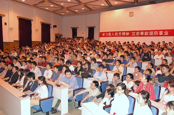 6名航天员在全场雷鸣般的掌声中入场,吴川生书记首先向同学们介绍了到场的6名航天员的情况,每介绍一位航天员,在学生中都会爆发出经久不息的掌声。吴书记还带来“神五英雄”杨立伟对我校学生们的问候。