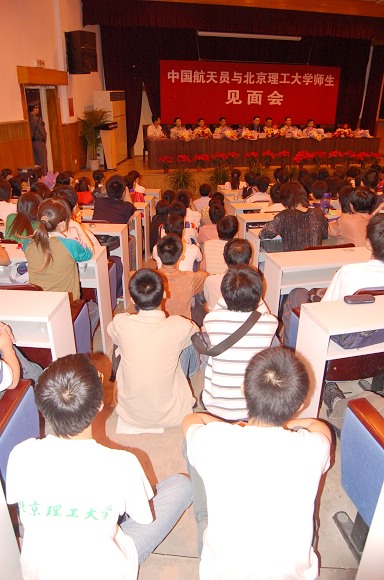 为满足现场学生高涨的热情,费俊龙、聂海胜等6名航天员与现场学生互动,回答了大家的提问。同学们问:在神舟六号环绕太空的五天里有哪些事是最难忘的?有哪些事是最遗憾的?航天员答道:我们只觉得那五天实在太短暂,当离开太空返航的瞬间,我们竟有些依依不舍。同学们还迫切想知道航天员们面对生与死的考验,面对忠孝不能两全时内心的感想,航天员们都将最真实的感受与现场的同学进行了诚挚的交流。有的同学还问怎样锻炼身体,什么时间最合适?航天员说:锻炼身体做重要是有规律,要有恒心,只要决定目标,就不要管道路多么曲折都要努力前行,他们还向同学们透露了一个小秘密,就是每天做三组俯卧撑,每组200个。为一睹中国航天员的风采,见面会现场还有远道而来的兄弟院校的学生。