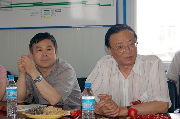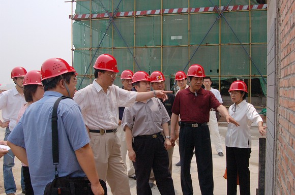 党委副书记、副校长杨宾和副校长李和章在观看学生宿舍楼群封顶过程。