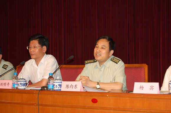 党委副书记、副校长杨宾与总参通讯部政治部主任陈向东一起为晋佩等14名优秀毕业国防生颁发了奖杯及证书。