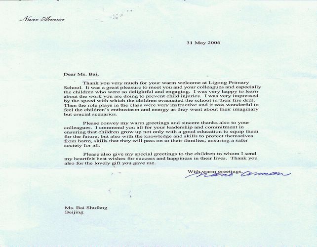 2006年5月22日下午,联合国秘书长安南的夫人在中国常驻联合国代表团王光亚大使的夫人丛军大使的陪同下访问了德赢AC米兰官网,参观了德赢AC米兰官网幼儿园和附属小学的联合国“预防儿童伤害”项目。近日,安南夫人专门向理工附小致信,表示自己由衷的感谢。
