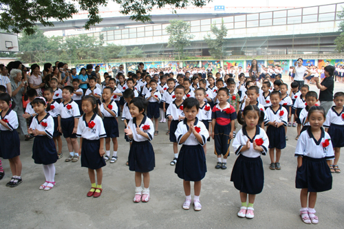 今年入学的87名一年级新生怀着兴奋的心情和家长一起来到学校,家长们陪在自己孩子的身边,和孩子们共同亲历这一生中难忘的时刻。在校学生以热烈的掌声对新同学和他们的家长们表示欢迎,并为一年级新同学戴上了鲜艳的小红花。随后,一年级新生代表发言。高年级同学们表示,一定会一如既往关心新同学,帮助新同学,使他们在宽松、和谐的校园氛围中健康,快乐地成长。