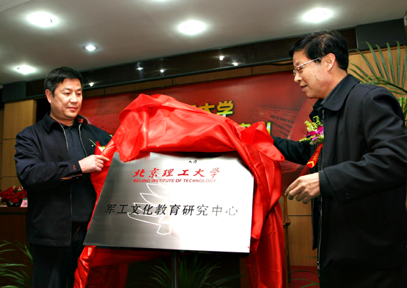 国防科技工业委员会直属机关党委常务副书记司德鹏(右)和我校副校长赵长禄共同为军工文化教育研究中心揭牌。