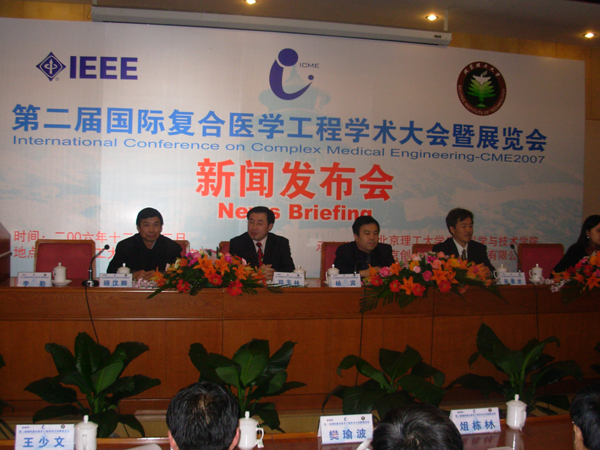 发布会由CME2007第二届国际复合医学工程学术大会组委会成员、我校生命科学与技术学院李勤老师主持。我校党委副书记、副校长杨宾向来宾介绍了我校在生命科学与技术方面科研的开展情况。来自日本的专家吴景龙教授和我校生命与科学技术学院院长邓玉林教授介绍了复合医学工程的概念和国家复合医学工程学术大会的情况,并阐述了复合医学工程在生命科学、医疗临床、监测、监护、影像处理、医学光学、医院信息化建设等领域的引导及应用。
