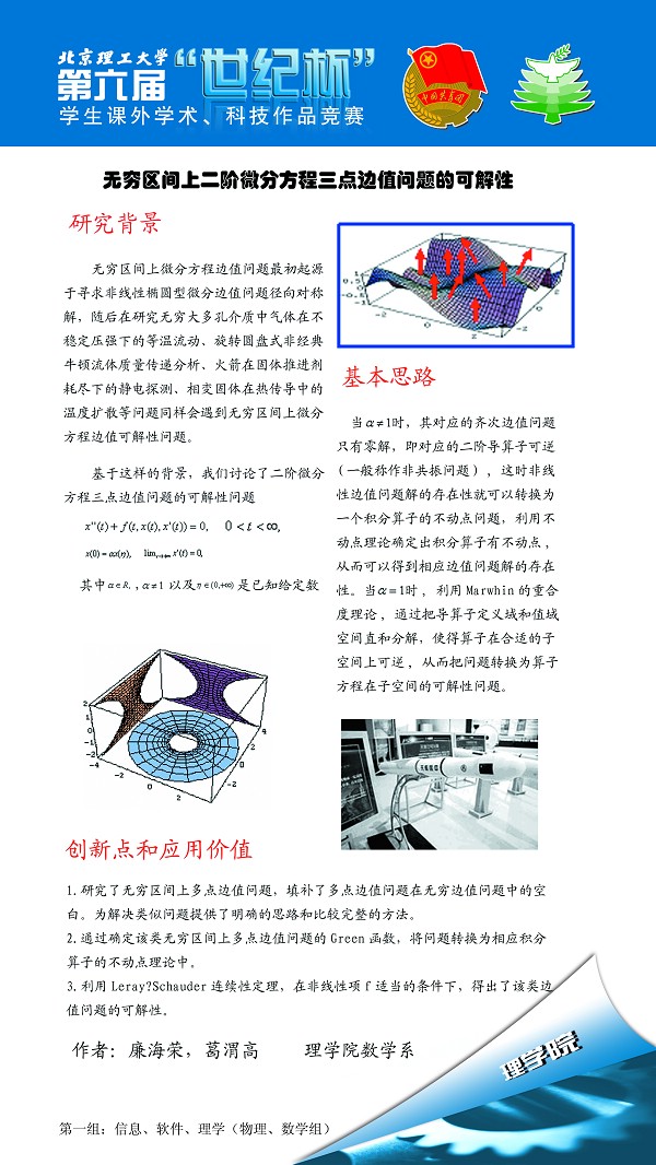 无穷区间上二阶微分方程三点边值问题的可解性 廉海荣(博士) 理学院数学系 二等奖