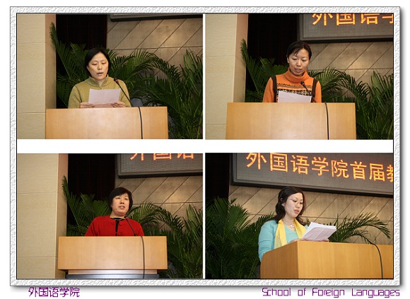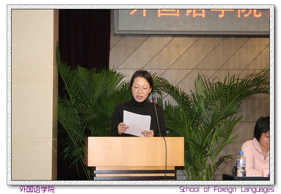 新当选的外国语学院首届教职工大会常设主席团主席姜爱红同志向大会宣读大会决议。