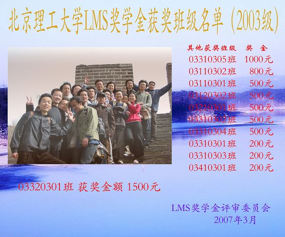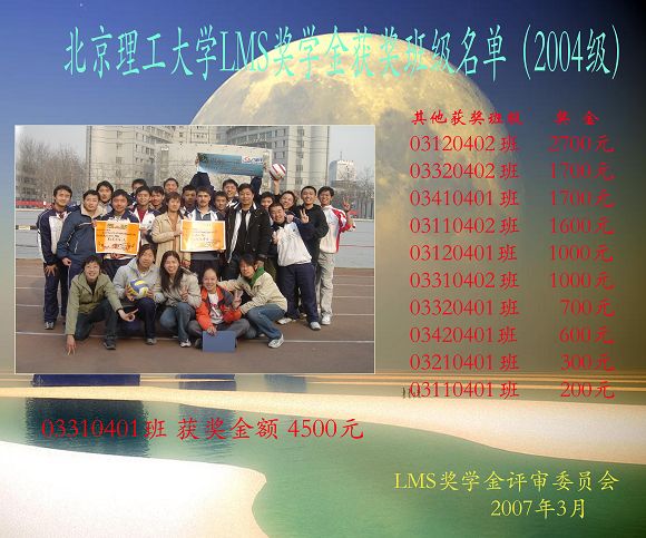 LMS奖学金是比利时LMS国际公司于2004年在我校设立的班级奖学金,主要奖励我校团结勤奋、学风优良、成绩优秀、积极进取、奋发向上、具有团结协作精神的本科班集体。此前已有60多个本科班级获得此项奖学金。