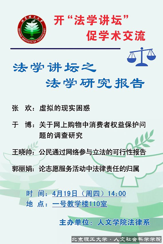 2007年4月19日,人文学院法律系法理研究生班在我校“模拟法庭”教学基地,正式开启了2007年度“法学讲坛——法学研究报告”系列讲座的序幕。该系列讲座以“促进学术交流,培养创新理论人才”为目标,自2005年开始已历经三年的发展,深受广大师生的关注。