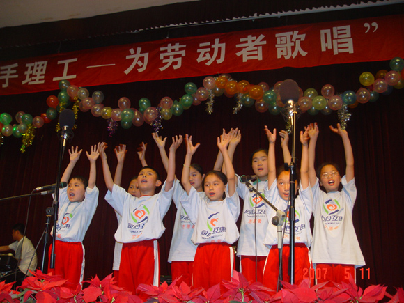 八位打工子弟首先为大家朗诵了《我是谁》,童言感人,催人泪下,令人感慨不已!一首《我是谁》开宗明义,向社会、向人们呼吁,要尊重劳动、尊重劳动者,因为劳动伟大,劳动光荣,劳动创造人,劳动创造世界!