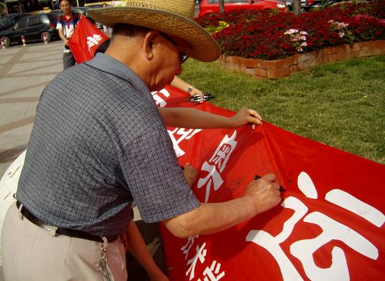 爷爷奶奶们拿其笔写下了他们对奥运健儿的祝福。