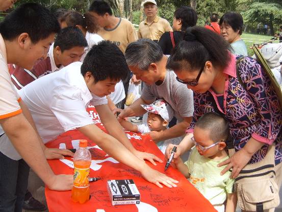 紫竹院公园里,我们的活动也在如火如荼地进行着。游人们积极地参与到我们的活动中,一位老大爷颤颤巍巍地拿起笔签下了自己的名字,并不时地点头说:“这活动好啊,好啊……”