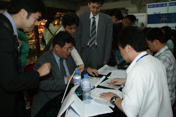 代表从现场注册,从制作胸卡、住宿、购买餐票、申请调换住宿、发放资料、开具发票等等一切内容都需在注册台上一气呵成。同时,后台要及时更新完成全部数据的录入,随时提供注册信息的查询。国内注册台在某些情况下还成了信息咨询台,不仅为中宾提供了大量的服务,而且对于外宾的咨询,他们也有问必答,甚至有一位外宾还将私人物品放心地存放在他们那里,约好时间再来取,他们这里俨然成为了物品寄存处。